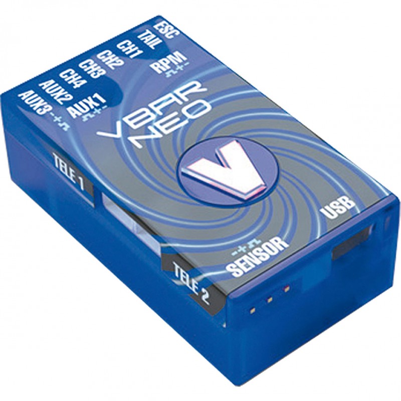 VStabi NEO ist eine neue Hardwareplattform, die mit neuester Technologie und zeitgemäßer Rechenleistung die Nachfolge sowohl für die Mini VStabi als auch für die VStabi Silverline antritt. Die Größe des Gerätes ist nur minimal größer als die Mini VStabi, von der Austattung her ist sie aber der Silverline ähnlich. So stehen 9 vollwertige Ausgänge und ein vollwertiger Anschluss für das Drehzahlsignal zur Verfügung. Ausserdem gibt es einen Anschluß für einen externen Sensor und USB direkt am Gerät, sowie zwei Telemetrie-Anschlüsse.