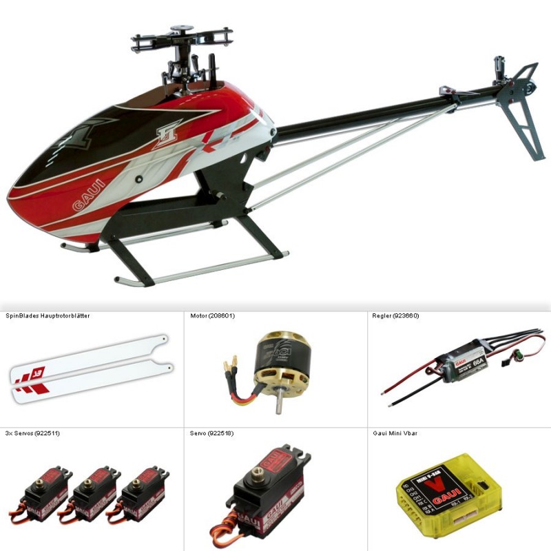 GAUI X4 II Super Combo SpinBlades (215014) Wieder ein Highlight aus dem Hause GAUI. Starpilot BOBBY WATTS hat zusammen mit den Ingenieuren von GAUI einen weiteren HighEnd Heli entwickelt, welcher jedes Heli-Piloten-Herz höher schlagen lässt! Hochpräziser CNC Aluminium Rotorkopf für überlegene 3D-Performance. Genau abgestimmter Servoblock der für praktisch alle Top-Servos geeignet ist. Neu entwickeltes, ultra-stabiles 100% Carbon-Chassis mit einfacher Montage. Neueste CCPM Steuerung für präzise und zuverlässige Flugsteuerung, egal ob Schweben oder härtestes 3D! CNC Torque Tube im Heckausleger. Einteilige CNC-Tail Box für maximalen Schutz des Heck-Antriebes. Neue, leichte Schubstangen für explosive 3D-Performance! Stromlinienformige FRP Canopy. Einschub-Akku-Fach. Lieferumfang: