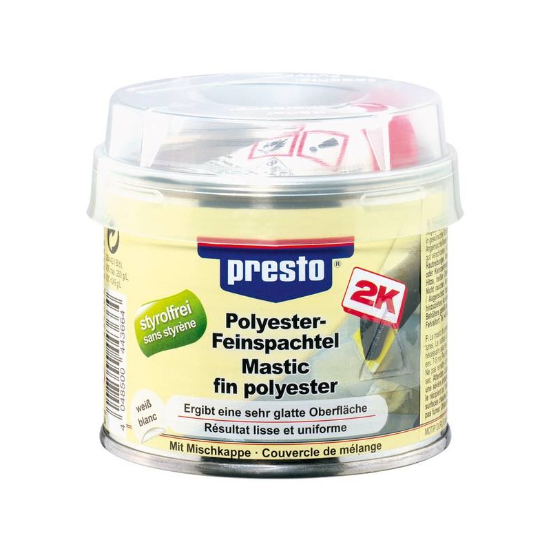Hochelastischer, zweikomponentiger Polyester-Feinspachtel in styrolfreier Qualität zum Ausfüllen kleinerer Unebenheiten und zum dünnen „Feinspachteln“ schon vorbehandelter Flächen. Geeignet für Untergründe aus Metall, Holz, Beton oder auf mit presto Füllspachtel vorgespachtelte Untergründe. Durch mikrofeine Füllstoffe erhält man eine sehr glatte Oberfläche.